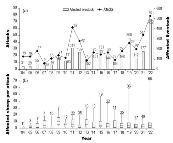 Number of reported wolf attacks and affected livestock (a) and number of affected (i.e., killed, injured, or lost) sheep per attack (b), showing minimum, maximum, median, inter-quartile range, and number of cases in Latvia from 2004 to 2022 (data from the Latvian State Forest Service).