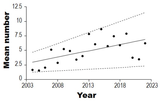 The mean number of affected sheep per reported attack increased from 2.6 (in 2004–2009) to 5.5 (in 2017–2022) with a slope of 0.219 (SE = 0.077) per year (Figure 3). This increase was found to be statistically significant (linear regression analysis, F1,17 = 8.16, p = 0.011).