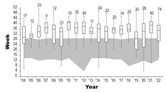 Timing of reported wolf attacks on livestock throughout the year (earliest, latest, median, inter-quartile range, and number of cases). Gray shading indicates period of closed hunting season for wolves.
