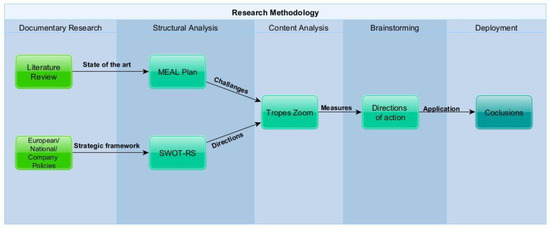 The methodology proposed in this paper has five main steps: literature and strategic document collection in the area of sustainable and low-carbon production, structural analysis on successive complexity layers, content analysis to determine the most adequate measures for implementation in the production sector, discussions of possible intervention directions, and their deployment (see Figure 1).
