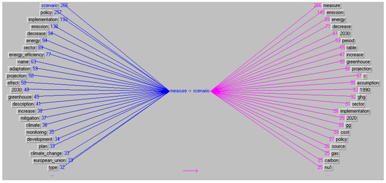 In Figure 4, a quantitative graph shows that the most frequently used word was “scenario”, and for it, the most frequently used relation was with the word “measure”. In general, when we talk about emission reduction strategies, they are developed and can be implemented if specific measures are applied in different reference scenarios. While useful in nature, the optimistic approach that is revealed in this way can leave too much room for a wavering commitment to change and reduce carbon emissions in the manufacturing sector. Although they are difficult and costly, we consider it preferable to develop new business models and new technologies early and avoid a slow change attitude, where companies jump from scenario to scenario, usually not fulfilling them and finding excuses. If there is popular support and a proper policy net, by involving digitization, bureaucratization and creativity, new strategies could be developed that will lead to new green economic sectors, with high employment and little environmental impact.
