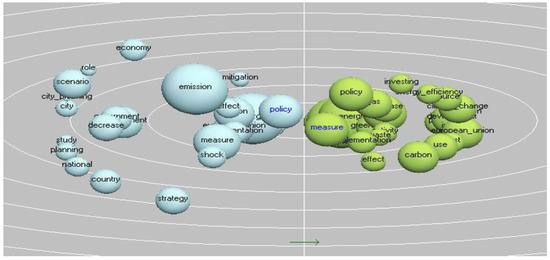 In the third part of the paper, the analysis of existing strategies focused on diminishing CO2 is deepened from the perspective of the 5 main strategies at the European level, with 14 national strategies focused on reducing emissions, in 6 countries, Austria—3, Bosnia and Herzegovina—2, Croatia—5, Germany—2, Republic of Moldova—1, Serbia—3, and the previously analyzed specialized articles. The research is a continuation of the second thesis and is carried out with the help of the Tropes Zoom v. 8.4.2 tool. Tropes Zoom is latent semantic analysis software capable of parsing large amounts of text and identifying correlations according to certain themes. In this chapter, our interpretations are being developed from the perspective of content relationships, i.e., keywords that have semantic relationships indicating possible directions of interventions across the body of literature (what is being done) and the body of policies (what is being pursued). In the bubble graphs below, element position indicates the relationship level within the analyzed text, and element size indicates the frequency of occurrence, while in the star graph, one can see the order of precedence and the number of existing connections, as per the Tropes Zoom Reference Manual [46].