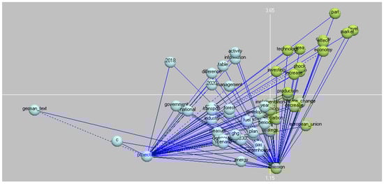 The following chart (Figure 6) highlights the importance of the relationship between “projections” and “emissions”. The positioning indicates that there are frequent relationships between the designated words and the other references. The reduction of carbon emissions achieved in reality must always be compared with the projections, and specific mechanisms should be developed for this when implementing industrial projects. This should involve dedicated equipment to measure results and to determine both the performance of companies and their processes and the need to improve the mathematical and physical models that form the basis of assumptions on which the production sector operates, as it is focused on being competitive.