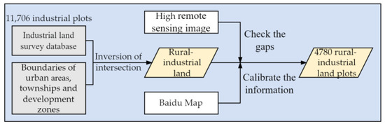 After deducting the industrial land located in the central urban area, various townships, and development zones of Wujiang District, we obtained the basic unit of performance evaluation (i.e., each rural industrial enterprise land plot) based on the characteristic that all industries located in rural areas can be classified as rural areas [45]. Based on this, the 2020 remote sensing image and Baidu Map data were used to calibrate the information and check the gaps in the database of rural industrial land according to the characteristics of industrial enterprises (such as floor area, roof color, and contour shape) (Figure 3). The final result was 4780 rural industrial land plots in the region, with a total area of 45.87 km2 (Figure 4).