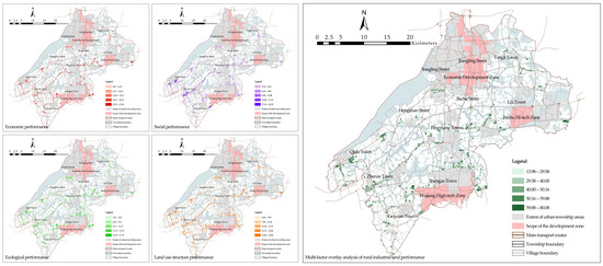 Table 3 indicates clear differences in the spatial distributions of the RILP grades. Low-performance rural industrial land is concentrated in Zhenze Town and Lili Town. The aforementioned areas contain 401 and 261 blocks, respectively, covering areas of 228.36 and 202.92 hm2. With medium-low performance, Zhenze Town contains the highest number of these blocks (227) and covers an area of 177.12 hm2. Medium-performance rural industrial land is mainly concentrated in Lili Town (178 blocks), Qidu Town (134 blocks), and Zhenze Town (123 blocks), covering areas of 112.90, 98.97, and 105.80 hm2, respectively. With medium-high performance, Shengze Town contains the highest number of these blocks (211), followed by Lili Town (182 blocks). The 211 blocks in Shengze Town cover an area of 266.63 hm2, and the 182 blocks in Lili Town cover an area of 176.88 hm2. High-performance rural industrial land is mainly concentrated in Qidu Town (143 blocks) and Zhenze Town (104 blocks), covering areas of 181.14 and 122.60 hm2, respectively. The spatial distribution of the RILP grading is displayed in Figure 6.