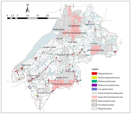 The performance evaluation scores were assigned to five low-to-high grades according to Jenks: low, medium-low, medium, medium-high, and high performance (Table 2). (1) The average land area of all grades significantly changed from low to high, gradually increasing from 0.78 hm2 of low performance to 1.48 hm2 of high performance, indicating that the grade division generally reflected the relationship between the performance level and the degree of industrial land scattered. With the improvement in land use performance, the corresponding rural industrial land sporadic degree decreases. (2) The grades covered areas of 1198.82, 828.61, 636.13, 999.28, and 924.19 hm2 and accounted for 26.13%, 18.06%, 13.87%, 21.78%, and 20.15% of the total rural industrial land area in the study area, respectively. The findings thus indicate that there is considerable potential for rural industrial land to be redeveloped and show that its performance evaluation is of great significance for boosting intensive use. In addition, the performance grades of rural industrial land with “sporadic distribution and small land area” are lower, while those of land with “agglomeration and cluster development” are higher. (3) From the distribution of the number of plots and the proportion of the area occupied by the corresponding grades, the number and proportion of medium performance are smaller than the low-medium and low performance of low performance and the high-medium performance of high performance. The number of plots involved in the performance grade and the area occupied show a dumbbell structure, which is close to the normal distribution characteristics, reflecting the relative rationality of the result of the grade division.