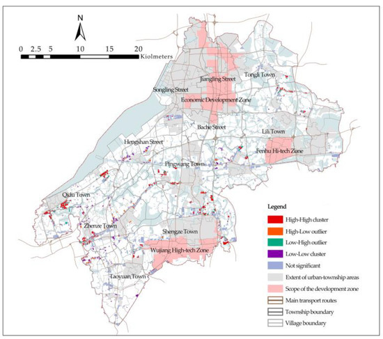To more intuitively observe the spatial differentiation of the RILP, we visualized the different clustering patterns of high and low values of RILP in the study area by drawing LISA clustering maps. The high–high cluster is mainly concentrated in the villages in the north of Lili Town, the middle of Pingwang Town, the northeast direction of Shengze Town, the southwest direction of Zhenze Town, and around the centralized construction area in Qidu Town. The low–low cluster is heavily concentrated in the villages in the centralized construction area of Hengshan Street and the west side of Lili Town, and the peripheral villages of Zhenze Town, especially in the marginal village zones of the township. The overall character of the area is high in the south and low in the north. In addition, many high–low and low–high outliers exist in each township, resulting in inevitable heterogeneity in the overall spatial distribution (Figure 7).