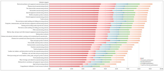 At present, Wujiang District has formed four leading industries (silk textiles, equipment manufacturing, electronic information, and photoelectric communication), but the rural industry type is still dominated by traditional labor-intensive industries such as silk textile and equipment manufacturing. According to the Industrial Classification for National Economic Activities (GB/T 4754—2017), we summarized and compared the average performance evaluation values of 30 manufacturing industries on rural industrial land in Wujiang District. There are significant characteristics of polarization and differentiation (Figure 9). Technology-intensive industries are represented by electrical machinery and equipment manufacturing, automobile manufacturing, and general equipment manufacturing, and emerging industries are represented by pharmaceutical manufacturing and chemical fiber manufacturing, due to the solid technological innovation capability and high R&D investment of the enterprises themselves, resulting in the outstanding high value of the performance evaluation of the rural industrial land to which these industries belong. The labor-intensive industries represented by the comprehensive utilization of waste resources, agri-food processing, metal products, machinery, equipment repair, and the wine, beverage, refined tea, and food manufacturing industries ranked relatively low in performance due to the low scale, low efficiency, and low technology of the enterprises. Therefore, in the future, inefficient industrial land scattered in townships should be concentrated in various industrial agglomeration areas based on industry types to achieve industrial clusters and spatial layout optimization.