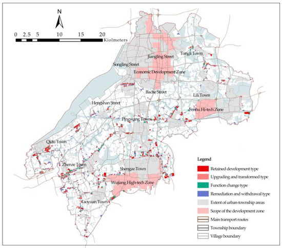 - Upgrading and transformation land covers an area of approximately 636.13 hm2, mainly comprising industries in urgent need of upgrading and transformation, with a focus on promoting industrial upgrading, transformation, and expansion. This will increase rural industrial land prices, development intensity, and other policies. Enterprises should also be guided to carry out specific land reclamation and renovation plans, and improve land use efficiency or output efficiency through technical reform, capital increase, production expansion, and other means. Enterprises that do not conform to industrial development guidelines should be required to carry out upgrading and transformation, especially in respect of energy-saving and emission-reduction technologies.