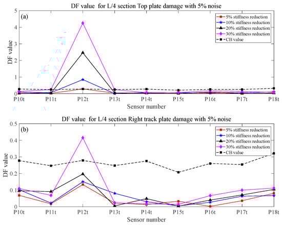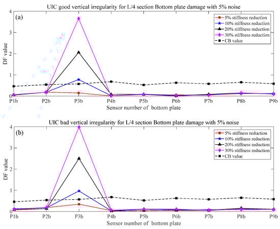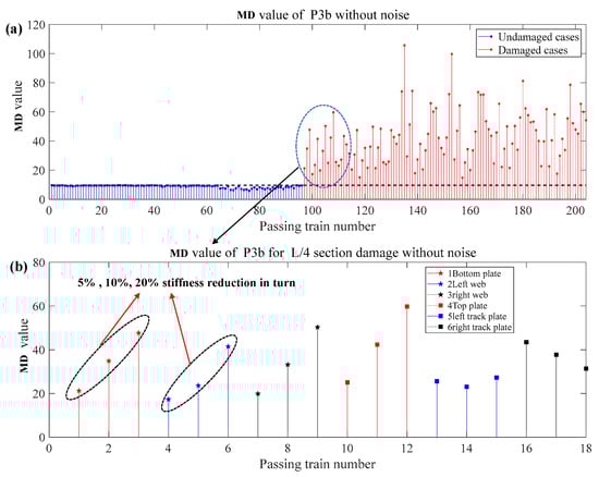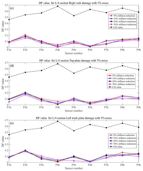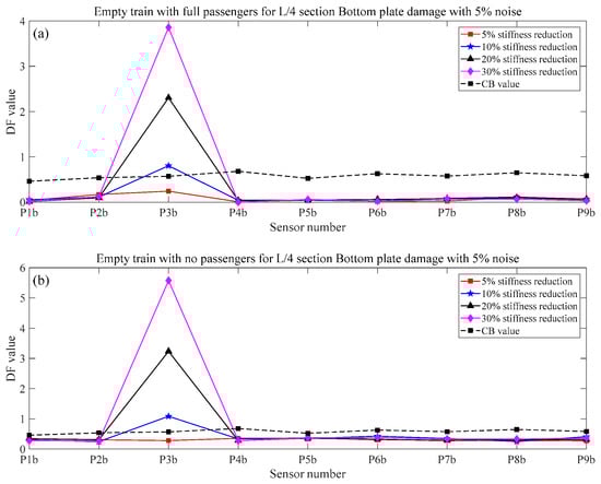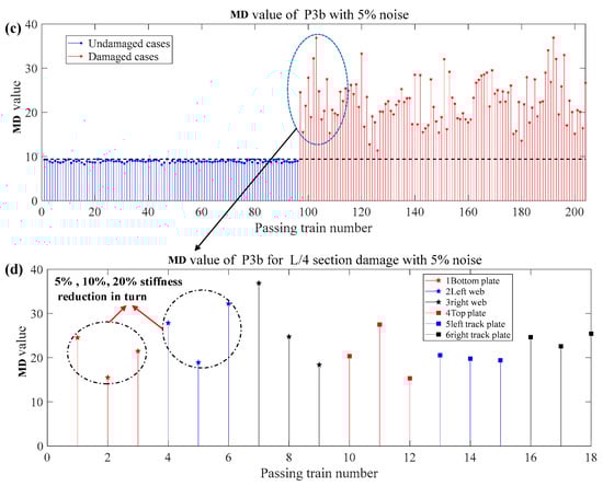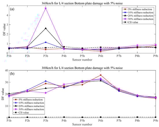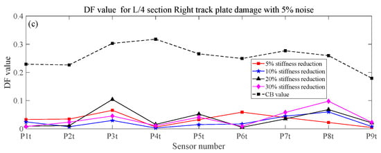 - The numerical simulation results show that the proposed method in this paper is sensitive to train speed, so the train speed needs to be calculated first by using a radar speedometer or the related algorithm. Even under the effect of noise, different train weights, and vertical track irregularity conditions, when the stiffness reduction factor of components is large enough, the proposed method in this paper can effectively identify, locate, and quantify the damage.