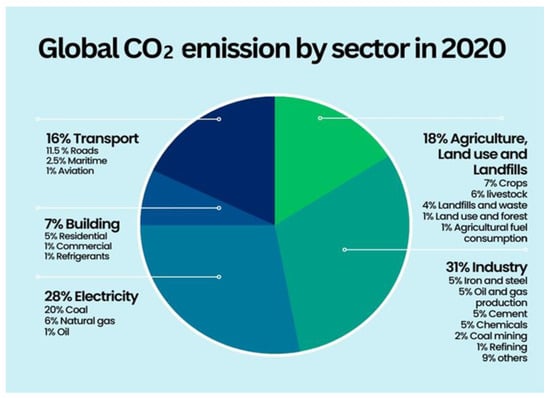 - Global CO2 Emissions by Sector 2021|Statista. Available online: https://www.statista.com/statistics/276480/world-carbon-dioxide-emissions-by-sector/ (accessed on 11 April 2023).