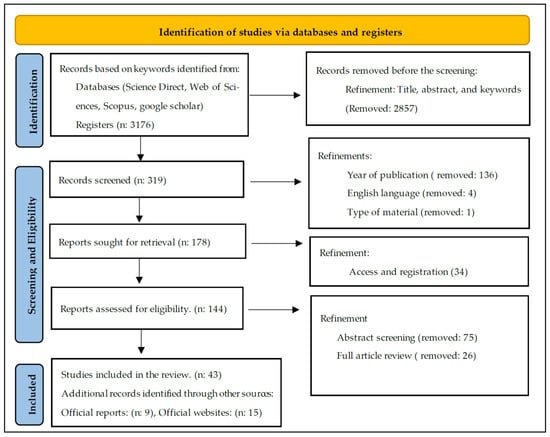 Forty-three articles were discovered using Internet search engines (Figure 2). Subsequently, a comprehensive search was performed, and 15 websites and nine reports on international standards, directives, statistical information, and reports associated with the focus of this research from international organisations and institutions were discovered. This comprehensive search was performed considering the primary objective and scope of research.