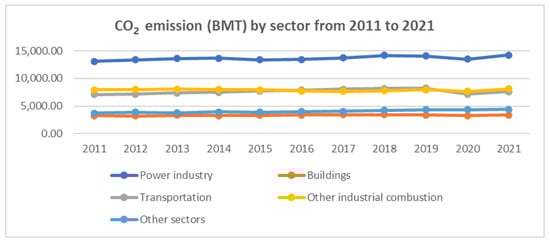 According to recent global statistical data on CO2 emissions in billions of metric tonnes (BMT) over the last decade based on reports of ‘Statista’ [9], the proportion of emissions by sector is as shown in Figure 3.