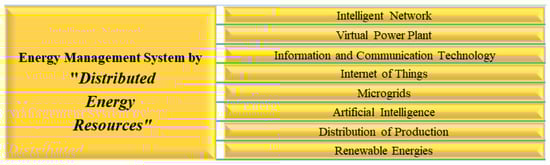 Through the DER, the components of EMS can be divided into eight primary categories: (i) intelligent network, (ii) virtual plant, (iii) ICT, (iv) Internet of Things (IoT), (v) microgrids, (vi) artificial intelligence (AI), (vii) distribution of production, and (viii) renewable energies, as illustrated in Figure 5.