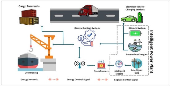 As shown in Figure 6, the central control system in an innovative system that runs with an intelligent network regulates the energy network and logistic control signal. It provides cargo terminals an on-site power supply known as cold ironing (CI) “Cold ironing, or shore connection, shore-to-ship power (SSP) is the process of providing shoreside electrical power to a ship at berth while its main and auxiliary engines are turned off” [17], transportation equipment (trucks), renewable energy production systems, energy storage systems, an electric vehicle charging station, and an intelligent grid that is connected (via a transformer for adjusting required power and voltage) to an intelligent metre to monitor the energy consumption. An intelligent energy central control system in a seaport regulates and connects each of these parts.