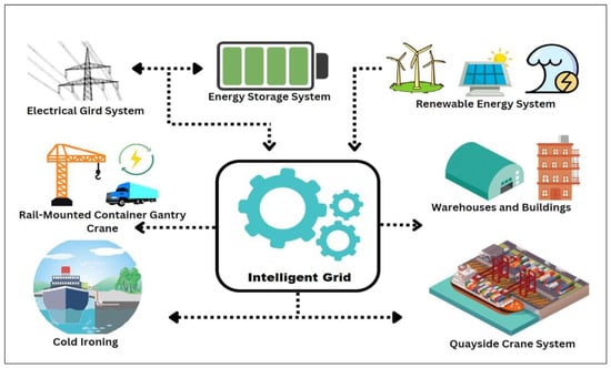 Figure 7 shows a high-level view of an EMS microgrid system at a smart seaport. This system includes a port with a cargo terminal containing warehouses and buildings, renewable energy sources and an energy storage system, and CI infrastructure and port facilities (including rail-mounted container gantry cranes, cargo load, and discharging facilities such as quayside cranes). All of these components are linked in an intelligent network and managed by a central control system.