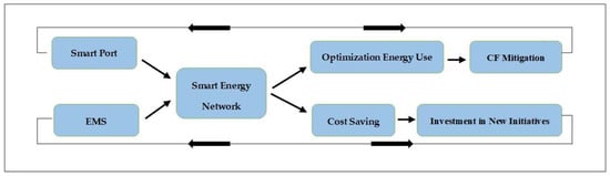 The effects of constructing an intelligent network in a seaport were examined by employing a two-stage programming technique in a study by Molavi et al. on intelligent management in smart ports. Their study demonstrated how installing an intelligent network at a port can drastically reduce energy use and carbon emissions. This intelligent network also demonstrated how effective infrastructure, suitable standards, and the EMS system work together to move toward sustainability, and finally, help mitigate climate change [18].