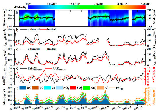 (a) The size distribution of PM2.5. (b) The absorption coefficients of heated and unheated aerosols collected by CAPs at 450 nm. (c) The absorption coefficients of heated and unheated aerosols collected by CAPs at 530 nm. (d) The absorption enhancement factor (Eabs) at 530 nm and the absorption Ångstrom exponent (AAE) between 450 nm and 530 nm. (e) The mass concentrations of PM2.5 and major chemical compositions.