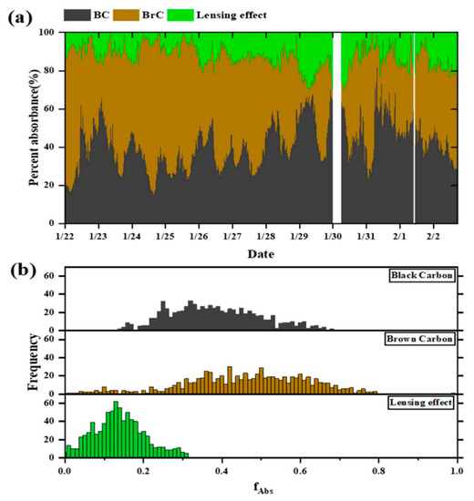 As shown in Figure 2, we quantified the contributions of BC, BrC, and the lensing effect to the total absorption at 450 nm, and the average absorption contribution percentages of BrC, BC and the lensing effect at 450 nm were 46.9 ± 15.7%, 39.0 ± 11.8% and 14.4 ± 6.7%, respectively. The histograms of the fractional absorption for BC, BrC and the lensing effect at 450 nm are presented in Figure 2b, and they show that the absorption of BC did not dominate the total absorption at 450 nm, while the absorption contribution of BrC exceeded that of BC during heavy pollution. The largest absorption contribution proportion of BrC could reach 78.3%. Since the average value of AAE between 450 nm and 530 nm was 5.3, the absorption at 300–400 nm would be 2–4 times that at 450 nm [27], implying that the radiative forcing induced by BrC at 300–450 nm was significantly greater than that caused by BC in Wangdu.