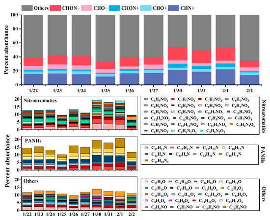 The formulas of BrC and their light absorption percentages at 365 nm, detected from samples of 10 days, including several groups: CHO−, CHO+, CHON−, CHON+, CHN+ and others.