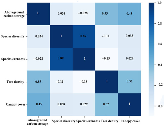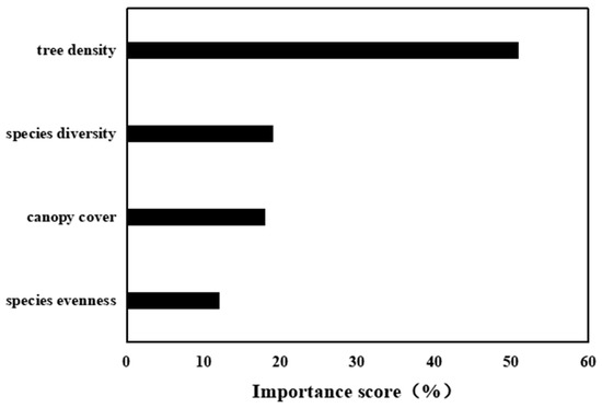 The 269 plots included four independent variables (tree density, canopy cover, species diversity, and species evenness) and one dependent variable (aboveground carbon storage) in the total transect. Advance statistical methods were used to verify the relationship between key vegetation traits and aboveground carbon storage. First, the study tested the homogeneity of variances by Bartlett statistical test before factor analysis. The results showed that the data distributions were normal, and it was suitable to analyze the correlation between factors by Pearson correlation analysis. The Pearson correlation analysis showed that canopy cover had the largest impact on aboveground carbon storage, followed by tree density. Species diversity and species evenness showed the least effect on aboveground carbon storage (Figure 2). However, it was difficult for the Pearson coefficients to accurately depict the relationship between the individual input variables and the output variable. This limitation was due to complex nonlinear relationships between multiple independent and dependent variables [35]. The random forest model offered an appropriate method to assess the nonlinear correlations.