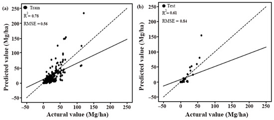 The correlation between the predicted and actual in training dataset (a) and testing dataset (b).