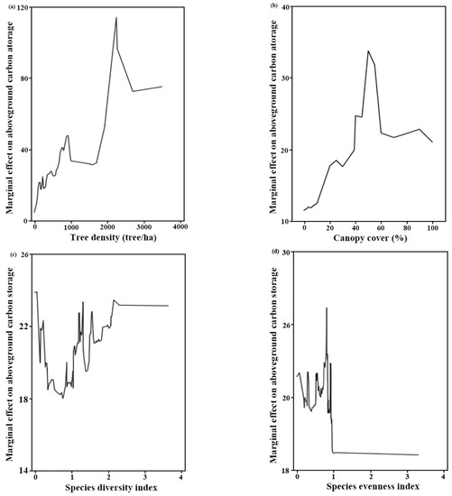Grimm et al. showed that human management, such as collection of illegal logging, directly controlled species diversity, and tree species diversity might contribute to aboveground carbon storage with functional diversity and dominance [43]. Therefore, aboveground carbon storage in our transect showed changing increases or decreases in different species diversity ranges. In the meantime, tree canopy cover is an indicator of the health of urban wood vegetation structures. Tòta et al. showed that the CO2 transport was significant in the lowest 10 m layer of the forest structure [44]. It means that tree canopy cover was an important influencing factor on aboveground carbon storage. In our study, the curve of marginal effect indicated that aboveground carbon storage reached a maximum when canopy cover was about 50%. Few researchers have quantified the impact of canopy cover on aboveground carbon storage like our study. Our study indicated that aboveground carbon storage was the largest at tree density of approximately 2200 trees/ha. To sum up, tree density of 2200 trees/ha, canopy cover of 50%, species diversity of 1.2, and species evenness of 0.8 could furnish a combination of factors most conducive to aboveground carbon storage in the transect.