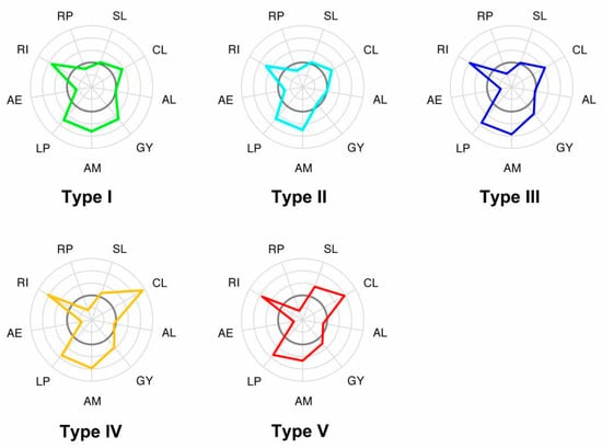 Based on the results of the hierarchical clustering analysis, the 217 samples can be divided into seven clusters. The number of samples in each cluster is 82, 41, 36, 35, 17, 5, and 1, respectively. Since the samples rarely merge into the last two clusters, they are not sufficient for further analysis and are, therefore, excluded. The remaining five clusters can be identified as the five main types of rural development. Each type is distinguished from others by its unique combination of the change rates of nine indicators. The median change rate of each indicator is selected to represent the characteristics of each type and is presented in Table 2. Figure 2 shows the difference between each type in radar charts.