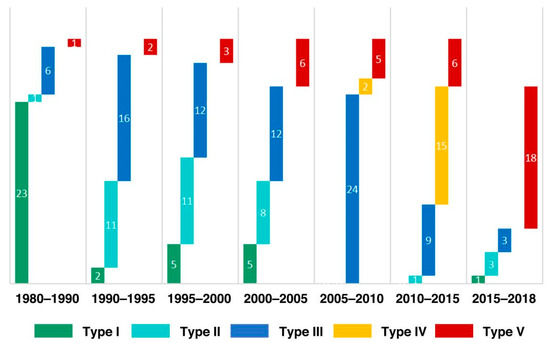 As demonstrated in Figure 3, different regions of China are dominated by different types at different times. We calculate the number of provinces, including autonomous regions and municipalities, of each rural development type in each cycle and show it in Figure 4. As can be seen from the graph, Type I was the predominant type in 1980–1990. From 1990 to 2005, Types I, II, III, and V coexisted, and none became the absolute majority. Type II and Type III made up a large portion of the total. After 2005, there was a tendency toward unification. Types III, IV, and V accounted for the largest number in the cycles 2005–2010, 2010–2015, and 2015–2018, respectively.