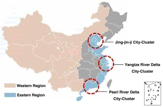 The western region, eastern region, and three major city clusters in China.