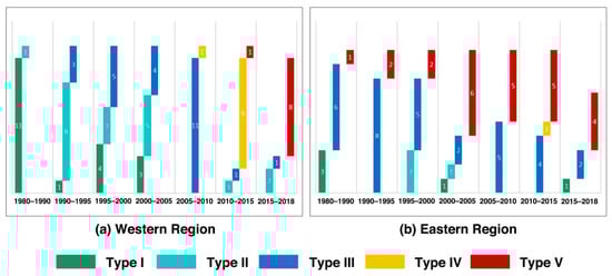 The eastern region consists of 10 provinces: Beijing, Tianjin, Hebei, Shanghai, Jiangsu, Zhejiang, Fujian, Shandong, Guangdong, and Hainan. It is demonstrated, in Figure 6, that Type III and Type V are the main types in each cycle, while Type I, Type II, and Type IV are hardly found. The vast plain areas and the relatively mild climate make the eastern region ideal for agricultural production. The limited number of Type I and Type II indicates that agricultural productivity is always increasing at a high rate. Moreover, all the provinces in the eastern region are located in coastal areas, so they have natural advantages in logistics and trade, which also provide a good foundation for industrialization. We can see from Figure 6 that Type III first appeared in 1980–1990, which was earlier than in the western region. With a large number of cities, the eastern region has always been the most densely populated area in China. The rural areas are also influenced by the prosperity of the cities. Therefore, until 2015, almost all the provinces that belong to Type V are located in the eastern region.