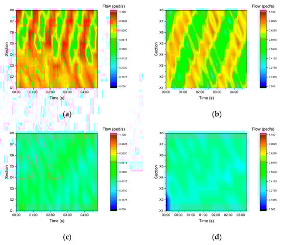 Next, the simulated spatiotemporal diagrams will be discussed. Firstly, the results of the local flow rates are shown in Figure 6. At low densities, the different regions with high flow rates and low flow rates alternatively emerge in Figure 6a,b. Different colors could be clearly observed, which means that the distribution of pedestrians is not homogeneous at low densities. In fact, the speeds of all pedestrians are high at these low densities, as shown in the fundamental diagrams (Figure 4). Thus, there is no congestion in Figure 6a,b. In addition, some time–space diagrams, which correspond to Figure 6, are shown in Figure 7. Here, the orders of chosen pedestrians are No.1, No.5, No.9, …, etc. Since the simulation is performed on a ring road, the angular trajectories of pedestrians are presented, which is the same approach as that used for the experimental study. It was found that, although the speeds of all pedestrians are similar, the angular distances between these pedestrians are different in Figure 7a,b, which also implies their spatial distribution is not homogeneous. This situation is qualitatively similar to that observed in the experiments.