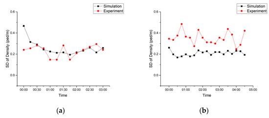 Additionally, the standard deviations of the flow rates are shown in Figure 10, while those of the densities are presented in Figure 11. Generally, the two curves in the many subfigures are close to each other, especially for the flow rates. However, it seems that, in some other figures, especially for densities, the results are a little different. For example, in Figure 10, the simulation results are lower while, in Figure 11e, the simulation results are higher. The tendencies in Figure 11f are also different; the simulation results gradually decrease with time, while experimental results significantly fluctuate. The main reason could be that the simulation results in this paper are averaged ones, while the experimental results are just obtained from one run, which may not be typical for certain densities, and stochasticity cannot be ruled out. In the future, it is necessary to collect more data to verify these situations.