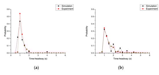 Excluding the macroscopic results discussed before, the microscopic analysis regarding the pedestrian movement is also important. Here, the time–headway distributions are chosen as examples, and the maximum value is set as 6s. As shown in Figure 12, for all the densities the simulation results are similar to the experimental results; at low densities, there exists one evident peak in Figure 12a,b. This is at about 1–2 s. However, with the increase in densities, the peak moves to the right side in Figure 12c,d, and gradually disappears. Finally, the distribution becomes quite flat in Figure 12e,f. In general, such tendencies are qualitatively similar to those observed in car-following behaviors, which also show some similarities between pedestrian flow and vehicular traffic flow.