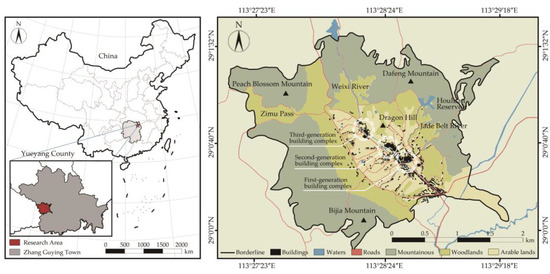 Zhang Guying Village is located in the Weidong Basin in the eastern portion of Yueyang County, Hunan Province, and has a total village area of 504.4 hectares. The topography of the Weidong Basin is dominated by hills and hollows, including Bijia Mountain and Dragon Hill. The Jade Belt and the Weixi River, which are intertwined in a Y-shape and run through the basin from northwest to southeast, are the primary water sources for the people living there. From the beginning of the Hongwu period (AD. 1368–1398) of the Ming Dynasty, Zhang Guying led clans into the eastern valley of Yueyang County in Hunan Province. The village was built along the Weixi River from south to north, with the first-generation building complex Dangdamen, the second-generation building complex Wangjiaduan, and the third-generation building complex Shangxinwu. At that time, the village’s public space system was established. After more than 600 years of development, it has maintained the public space structure and appearance of the village formed during the Ming and Qing dynasties [13]. The Jiangnan ancient residential building complexes and public space system in Zhang Guying Village are the most complete and unique in terms of their historical and cultural significance in China (Figure 1).