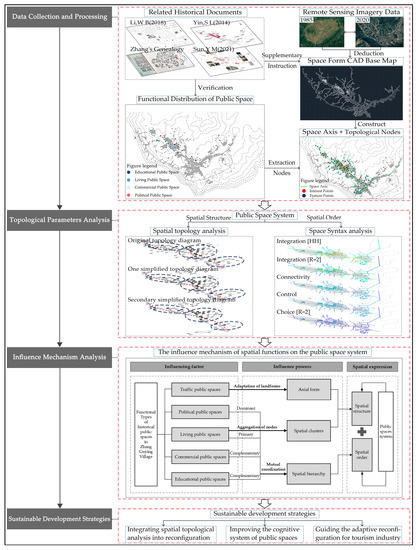 In recent years, space syntax based on topology theory has been widely used to analyze the relationship between space and human activities, mainly in terms of spatial morphology, spatial function, spatial order, and wayfinding [54,55,56]. As research progressed, Griffiths proposed that because space syntax can offer an unbiased quantitative description, it helps advance historians’ comprehension of how spatial form changes affect people’s lives and urban culture [57,58]. Space syntax can be applied to analyze historical texts, maps, and images [59,60,61]. The public spaces of Chinese traditional settlements have evolved over the centuries and have a long history. Based on the historical map of traditional settlements, Qi et al. constructed a network with a road system and employed space syntax to analyze the degree of integration and connectivity of public spaces. Then, they summarized the typical characteristics of traditional settlement public space form and order and converted an earlier qualitative description of the differences into a quantitative comparison of structures [62,63]. Du and Zhang et al. extracted the structure and order characteristics of traditional settlements’ public spaces and parameters, such as intelligibility, connectivity, control, and depth value, through the convex space analysis method, axis analysis method, and horizon analysis method of space syntax and conducted a correlation study between villagers’ behavior and the spatial layout of the village [64,65]. Dai et al. [66] confirmed the existence of an isomorphic relationship between public spatial structure and function through a space syntax analysis of 27 traditional settlements and proposed that spatial functions have an important role in maintaining the stability of the deep spatial structure in the evolution of village morphology. However, they did not elaborate on how public spatial functions maintain the stability of the spatial structure. Chen and Wei [67] confirmed the spatial relevance of ecological, productive, and living functions in traditional settlements using space syntax. However, these studies did not fully explain the interactions between spatial functions and structures.