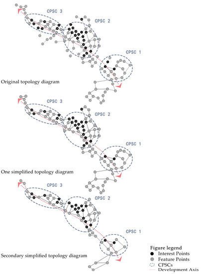 A topological structural diagram of the village’s public spaces was obtained by extracting a public space network. Furthermore, their morphological characteristics were summarized. There were 114 topological nodes in the public space network of Zhang Guying Village, comprising 28 public space interest points and 86 related road feature points. A more concise public space topology diagram was obtained after executing the simplification command twice (Figure 4).