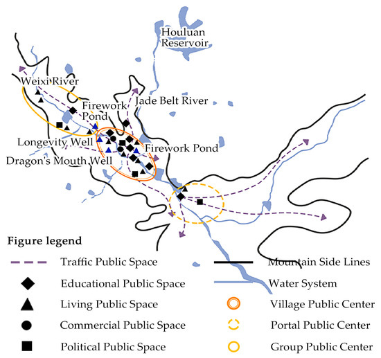 Public spaces are defined as publicly owned places or privately owned spaces which are designated for public use [23,24], and are essential for the functioning and the quality of life [25]. Public spaces can serve various functions, including recreation, transportation, commercial activities, social interaction, cultural events, and civic engagement [26]. The distribution and combination of public space units form a public space structure and exhibit unique spatial morphologies [27]. Public space systems refer to the network and orders of public areas, which offers a very helpful entry point to understand and manage the emerging complex challenges for the built environment and urbanization [28]. Although the meaning of public space in Chinese traditional settlements has not reached a uniform understanding, it is generally agreed that public spaces in traditional settlements are both the public property of society and the space property of materials [29,30,31]. In other words, the public spaces of traditional settlements serve as locations for villagers to freely congregate and engage in various social activities [32]. These include fixed public activity locations, such as ancestral halls, temples, shops, schools, and squares, carrying out the functions of politics (religion, sacrifice), commerce, education, life (gathering, performance, leisure, etc.), and transit.