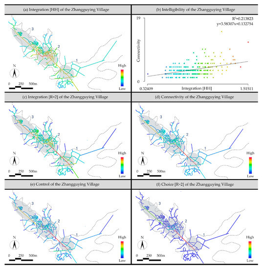 A correlation analysis of the degree of connectivity and global integration of public spaces in Zhang Guying Village yielded an intelligibility of R² = 0.2138 < 0.5 (Figure 6b), suggesting that it is difficult to establish the cognition of the overall public spaces through the local public spaces of the village. Thus, the three CPSCs in Zhang Guying Village are highly endogenous and have strong internal intelligibility, but the overall public spaces of the village are not discernible.