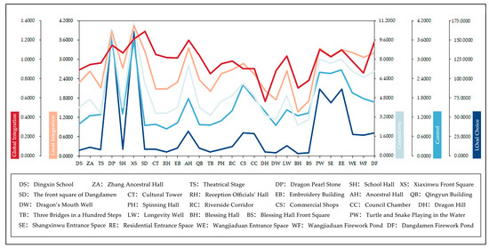 Regarding the control and local choice, which reflect the importance of space, the ranking is also “political type > living type > commercial type > educational type” according to Table 6. Political public spaces were the most controlling and constraining, consistent with the actual situation wherein Chinese traditional settlements are maintained mainly by clans and blood. Additionally, living and commercial public spaces were the second most powerful, whereas educational public spaces had a minor influence on the spatial order.