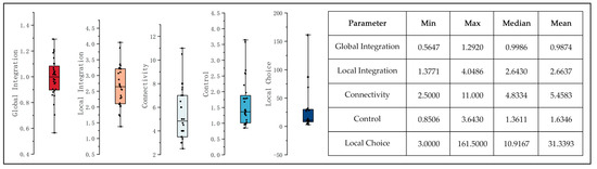Based on the topological network structure analysis, we further analyzed the topological parameters of the three CPSCs in the public space structure. Figure 6 and Figure 7 show the characteristic parameters of global integration, local integration, connectivity, control, local choice, and intelligibility of different functional public spaces in Zhang Guying Village. Figure 8 shows the overall distribution of the characteristic parameter data, including the maximum, minimum, median, and mean values for each parameter. Table 5 shows the average values of each spatial characteristic parameter of the different CPSCs. Next, we analyzed spatial integration, spatial intelligence, spatial accessibility, spatial control and local spatial choice to reveal the influence of the spatial functions on the CPSCs.