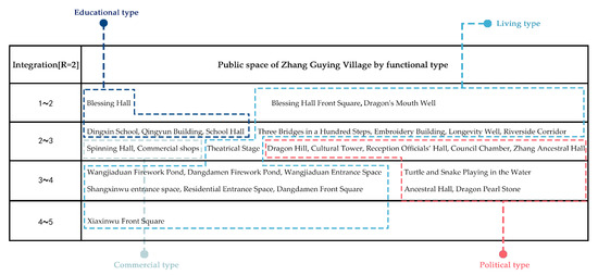 Figure 9 and Figure 10 show that the local integration of all public spaces in the village ranged from 1–5. The local integration of public living spaces spans the largest range, indicating that living public spaces are widely distributed to meet the various needs of villagers. For instance, the Blessing Hall front square is located in a poorly accessible location deep in the village and is mainly responsible for evacuating school crowds. The Dangdamen front square is located at the geometric center of the village. It is more accessible and takes on the function of holding large celebrations and drying crops during the harvest. The local integration of political public spaces was concentrated in 2–4, mainly distributed in places with relatively high accessibility, such as the Zhang Ancestral Hall, located at the village entrance, which, with its convenient transportation and open areas, easily becomes a place for public gatherings. The local integration of commercial and educational public spaces was mainly in the range of 1–3, relaying that these two types of public spaces are located primarily in areas with low accessibility. For example, the Blessing Hall is located at the end of the village and does not overemphasize public openness.