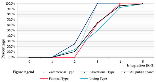 The average local integration and connectivity parameters reflect the overall accessibility of the different functional types of public spaces. As the overall trend of local integration and connectivity data is consistent, this study adopts the method of averaging the local integration of each spatial unit of the four types of public spaces—political, commercial, living, and educational—and then counting the proportion of public space units with different local integrations to further clarify the accessibility differences of each functional spatial unit in the public space system.
