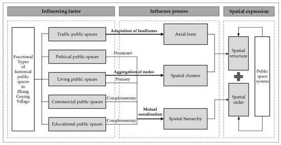 - Based on functional differentiation, the public spaces in Zhang Guying Village are divided into five types: political, commercial, living, educational, and traffic. An analysis of the topological parameters of spatial syntax revealed that the first four types of public spaces work together to generate the public space structure and order of traditional settlements under the linkage of traffic public spaces.