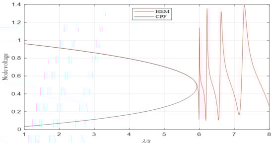 From Figure 2, it can be concluded that the holomorphic embedding method tracks the P-V curve obtained by the continuous power flow method and starts to oscillate when it approaches the critical point of the continuous power flow method. The zero-pole distribution diagram can be obtained from Figure 3, and the smallest real zero-pole is found. It can be known from the Padé approximation that the minimum real zero-pole is the fulcrum of the multivalued function. The series cannot converge at this point, so the minimum real zero-pole is the critically stable point of the voltage.