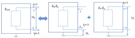 Formulas (27) and (28) indicate that the electrical distance between power system buses i and j is defined as the equivalent impedance between two points, which is numerically equal to the voltage between buses i and j after injecting unit current elements from bus i. The elements of the system bus impedance matrix available for are expressed as follows: is the system bus impedance matrix row i and column j elements. The schematic diagram of the equivalent impedance matrix is shown in Figure 4.