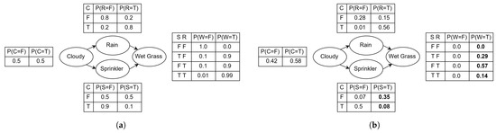Representation of a graph with associated probabilities, adapted from [58]: (a) BN without evidence; (b) BN with evidence of wet grass.