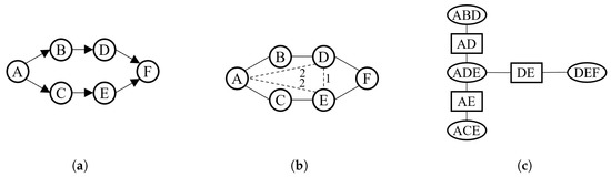 Steps of a junction tree algorithm (adapted from [75]): (a) Bayesian network; (b) triangular graph; (c) junction tree.