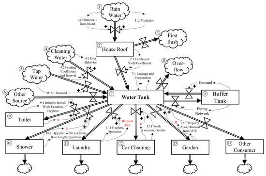 As for user-induced consumers, the model integrates toilet (9), shower (10), laundry (11), and car cleaning (12) with their daily water demand, based on either values from standards or provider data. The influencing factors (10.1, 11.1, and 12.1) map the characteristics from the consumer model described above. The garden (13) is considered a context-specific consumer, as it depends on the garden size and needs to be watered differently depending on the outdoor temperature (13.1). The current implementation uses an average irrigation demand of 2.5 L per square meter per day, which is integrated into the mass balances when the temperature is above 15 °C. To be able to expand the system on the consumer side, it is also possible to model additional consumers (14). For evaluating different scenarios for tank size and for resource balancing procedures, an additional buffer tank (15) is implemented in the model.