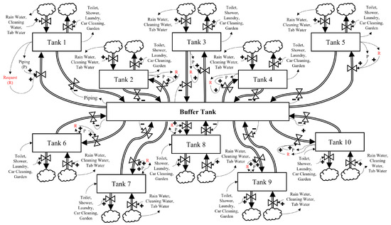 Another System Dynamics model represents the super system of a neighborhood with ten residential units (Figure 5). The use of a central buffer to balance resources between individual housing units plays a key role in this. Note that the central buffer does not have its own catchment, such as sidewalk gutters, but is fed only by the connected residential units. Each residential unit contains its own water tank, into which the entire water collection of the residential unit enters as input and the total consumption of the residential unit leaves the tank as output. Surplus water can be fed into the buffer tank by the individual housing units and can also be retrieved when the buffer tank is filled (15.1). In addition, the piping network (15.2) has to be filled before the water reaches the consumers so that the length and pipe dimensions are also stored.